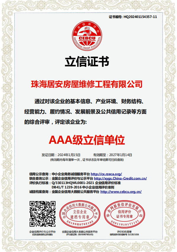 珠海居安房屋維修工程有限公司成立于2020年,是一家專(zhuān)注房屋維修的公司。我們擁有各類(lèi)型專(zhuān)業(yè)人才,業(yè)務(wù)包括老舊建筑翻新改造、外墻空鼓修復(fù)、防水幕墻養(yǎng)護(hù)、外墻預(yù)置構(gòu)件拆除更換、供排水管網(wǎng)改造、墻面翻新、鋼制結(jié)構(gòu)建筑構(gòu)建及折除,外墻清洗及裝修裝飾。